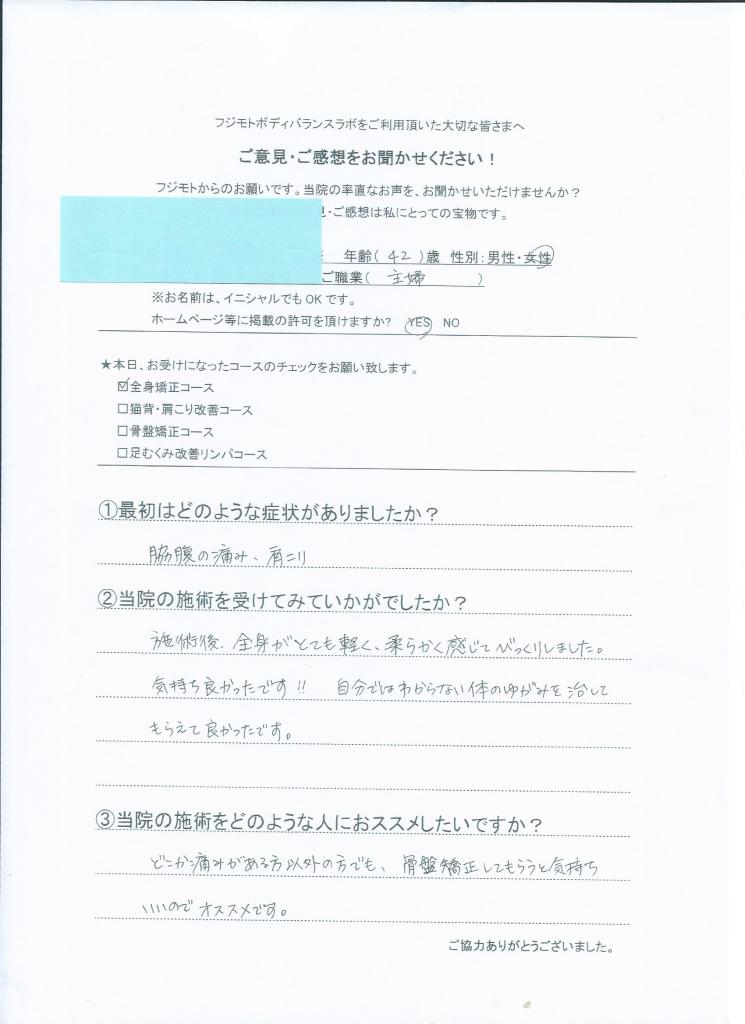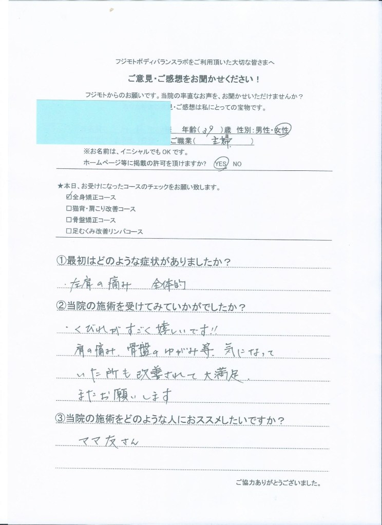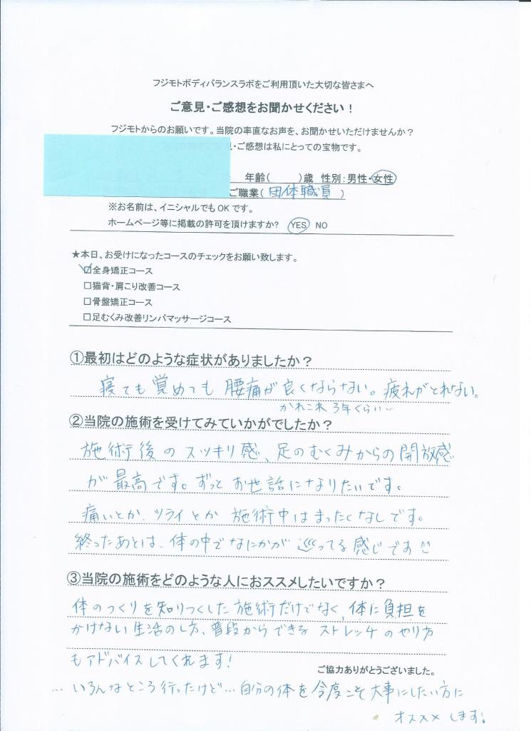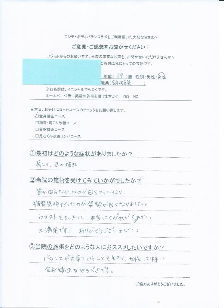 猫背気味だった姿勢が良くなりました。ウエストもすっきりし本当にくびれができました。 バランスが大事ということを知り、女性は特に全身矯正をやるべきです。 (30代 女性)